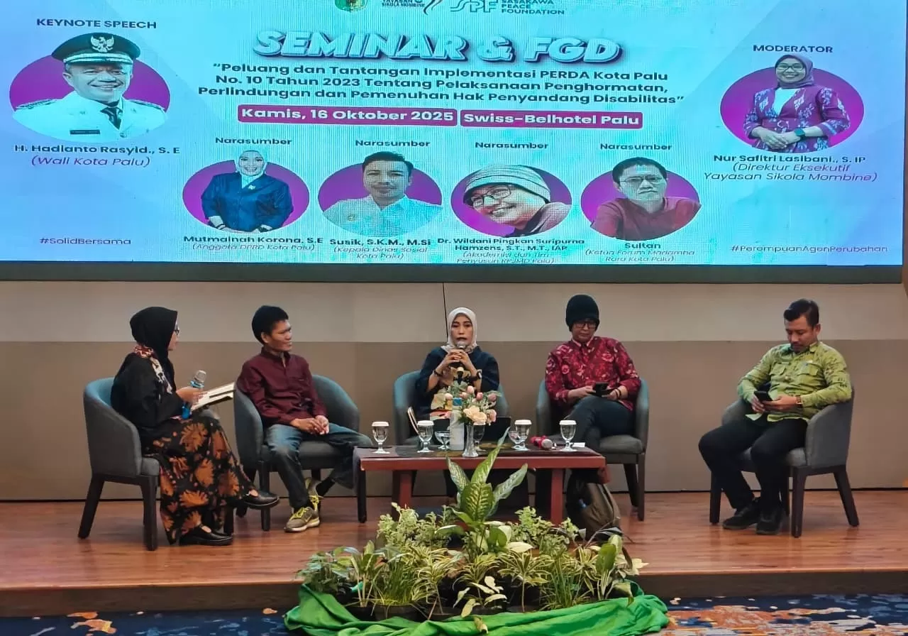 PALU, HAWA.ID — Sejumlah pemangku kepentingan membahas peluang dan tantangan penerapan Peraturan Daerah (Perda) Kota Palu Nomor 10 Tahun 2023 tentang Pelaksanaan, Penghormatan, Perlindungan, dan Pemenuhan Hak Penyandang Disabilitas dalam Seminar dan Focus Group Discussion (FGD) yang digelar di Swiss-Belhotel Palu, Kamis (16/10/2025).