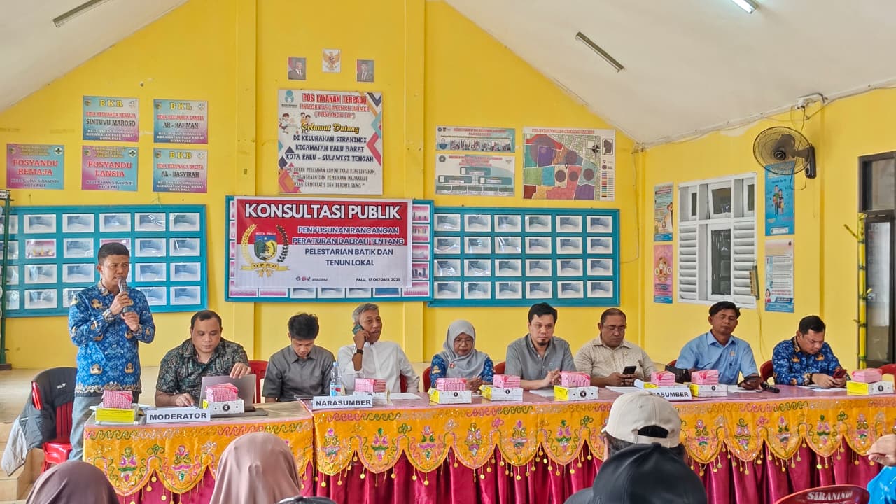 PALU, HAWA.ID — Dewan Perwakilan Rakyat Daerah (DPRD) Kota Palu melalui Badan Pembentukan Peraturan Daerah (Bapemperda) menggelar konsultasi publik atau Focus Group Discussion (FGD) terkait penyusunan Rancangan Peraturan Daerah (Raperda) tentang Pelestarian Batik dan Tenun Lokal, Jumat (17/10/2025), di Kelurahan Siranindi, Kecamatan Palu Barat.
