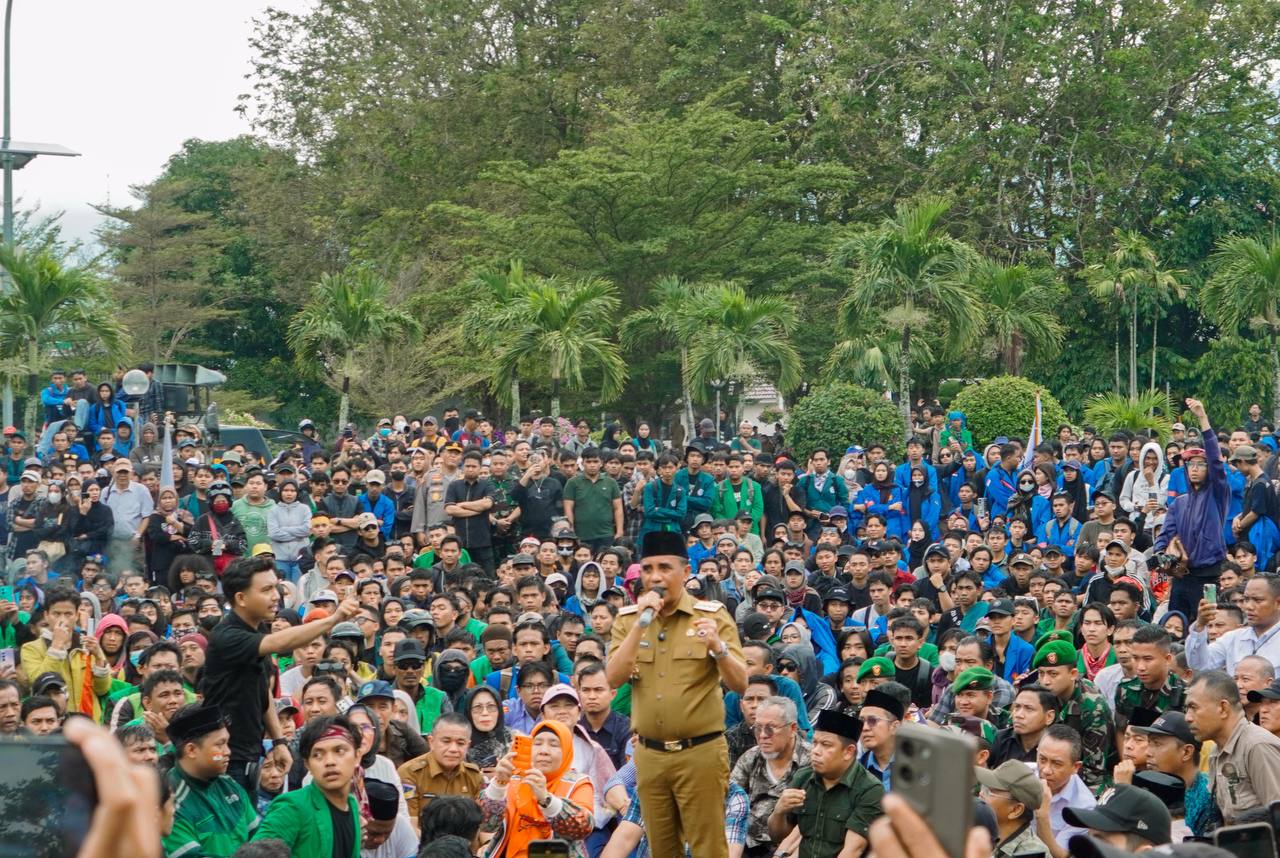 PALU, HAWA.ID – Gubernur Sulawesi Tengah, Dr. H. Anwar Hafid, M.Si., duduk bersama ribuan massa aksi di depan Kantor DPRD Sulteng, Senin (1/9/2025). Aksi yang berlangsung di tengah rintik hujan itu berjalan tertib dan dihadiri sejumlah pejabat daerah.