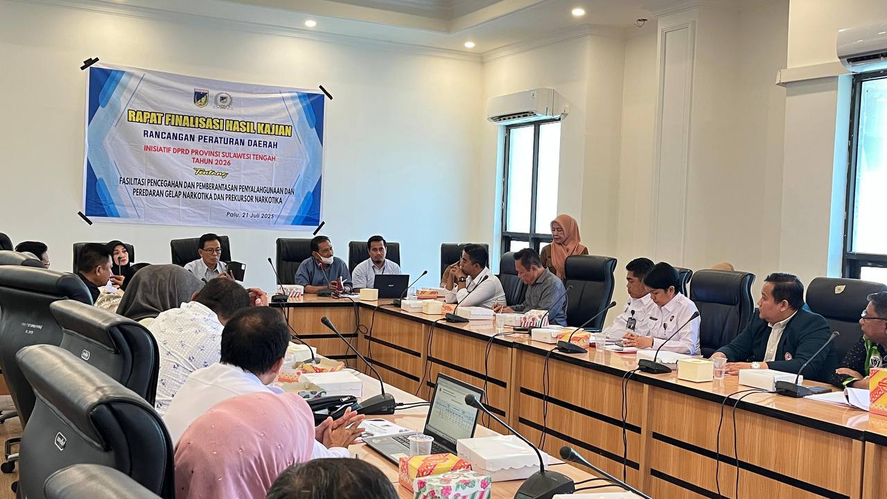 PALU, HAWA.ID — Komisi I DPRD Provinsi Sulawesi Tengah menggelar rapat finalisasi hasil kajian terhadap Rancangan Peraturan Daerah (Ranperda) inisiatif DPRD Tahun 2026 tentang Fasilitasi Pencegahan dan Pemberantasan Penyalahgunaan serta Peredaran Gelap Narkotika dan Prekursor Narkotika. Rapat berlangsung di Ruang Baruga, Gedung B DPRD Sulteng, Senin (21/7/2025).