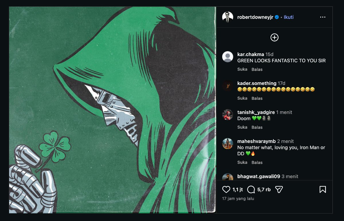 LOS ANGELES, HAWA – Aktor Robert Downey Jr. Doctor Doom kembali memicu antusiasme penggemar Marvel dengan mengunggah foto bertema St. Patrick’s Day melalui akun Instagram resminya pada 17/03/2026. Unggahan tersebut menampilkan ilustrasi karakter Victor von Doom yang memegang daun semanggi sebagai bagian dari rangkaian kampanye visual menjelang perilisan film Avengers: Doomsday.